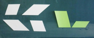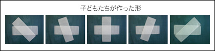 提示するときは,重なり具合が見えるように,薄い上質紙を使い,ラミネート加工しておくと良い。できた図形を出し合うときはやや大きめの形を準備しておき,子どもの作った形を発表させながら黒板に貼っていく。 |