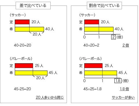 極端な例を示し,もとにする量がちがうので差では比べられないことをおさえる。