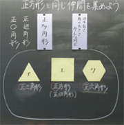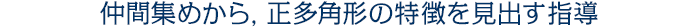 - 仲間集めの指導を通して,正多角形の特徴を捉え,意味を理解する