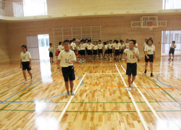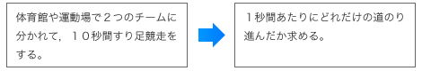 ![]() ![]() 計測しやすいように10秒間のすり足競走をさせて,長さを測定する。 その後,1秒間あたりの長さを求めるようにする。 |
