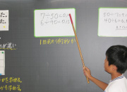 速さの定義につなぐために,1秒間あたりに走る道のりで比べるとわかりやすいという発言を取り上げて速さのまとめとする。 |