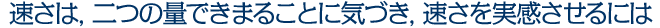 「速さ」は,「単位量あたり」で学習したように異なる二つの量の割合としてとらえる量である。従って速さを求めるには,「移動する長さ」と「移動にかかる時間」という二つの量が必要になり,「速さ」は,単位時間あたりに移動する長さとしてとらえられるようにすることがねらいである。