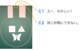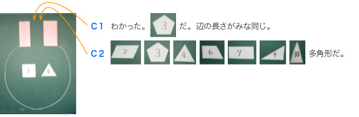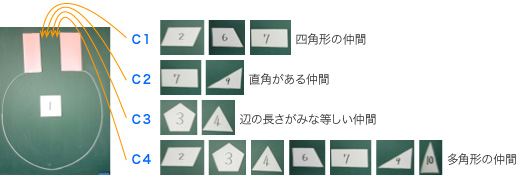 ![]() 最初に正方形を仲間の学校に入れることで,これまで学習した図形の観点でいろいろな仲間集めをさせる。 |