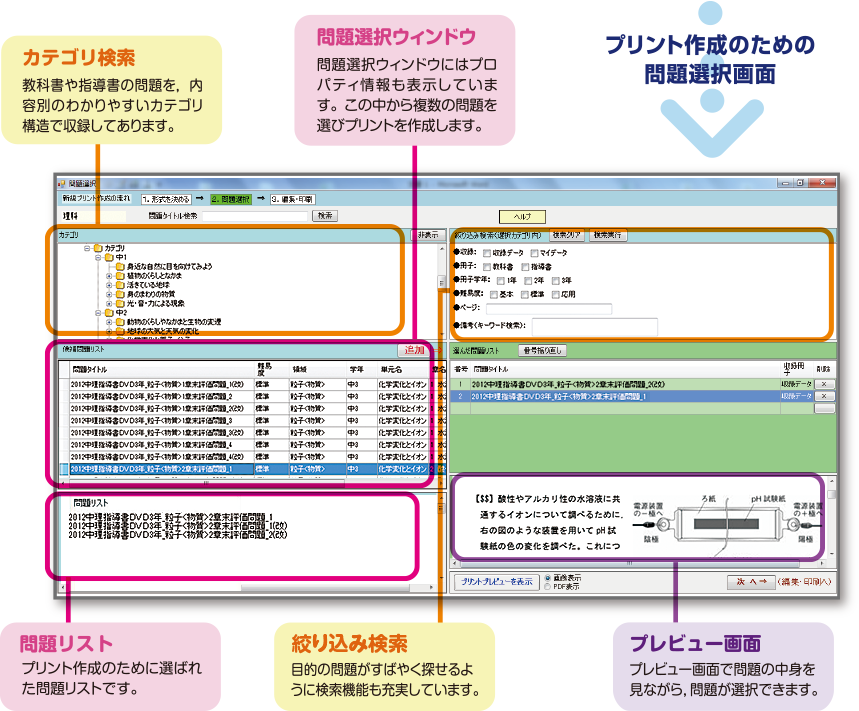 Microsoft Word(2007〜2013)のアドインソフトです。このソフトをインストールすれば、Wordが検索機能をもったデータベースソフトに変身します。教科書の問題や図が収録されたデータベースから、問題や図を選んでいくと、簡単にテスト用プリントが作成できます。さらに、先生が新規に作成された問題もデータベースに追加登録することで、どんどんとデータベースが充実していきます。授業やテスト用プリントの作成に是非ご活用下さい。