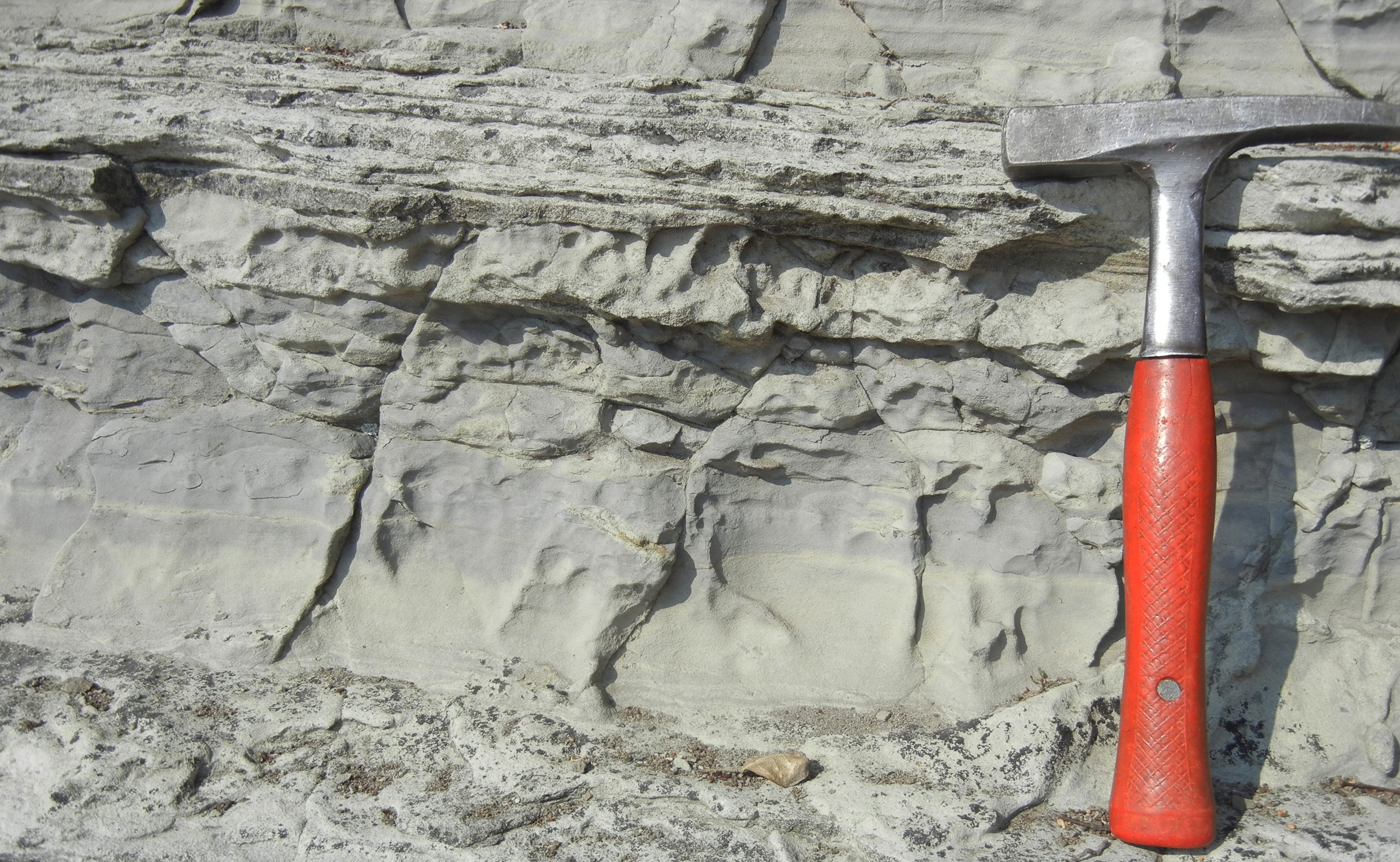 の混じった砂岩でできている。白っぽい灰色でへこんでいる層は,でい岩でできている。砂岩層はかたいのでけずられにくく,でい岩層はやわらかいのでけずられてへこんでいる。