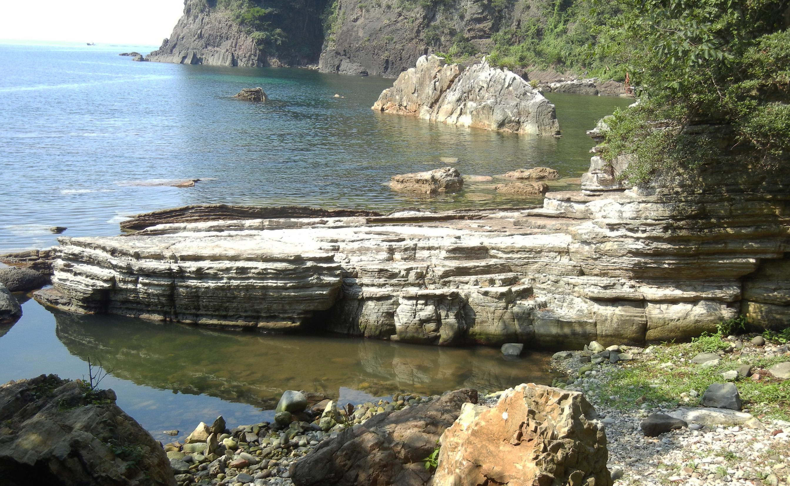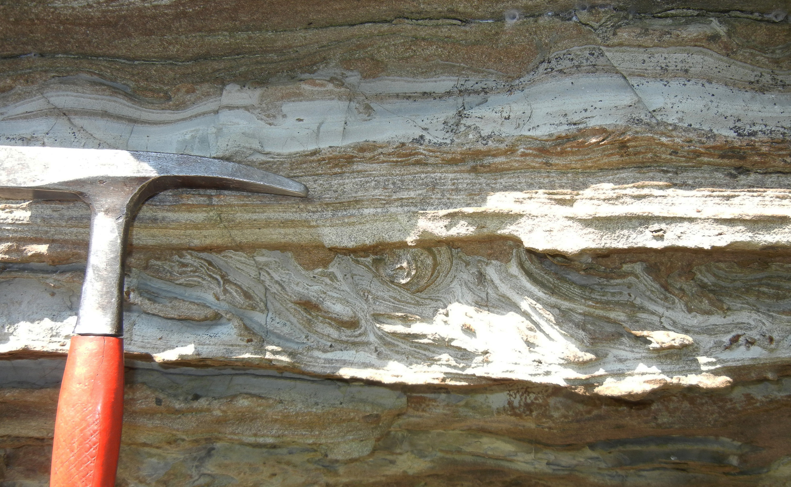 砂岩とでい岩の層がこうごに積もってできた地層。よく見ると,うずをまいたところや,ぐにゃぐにゃとした地層が見られる。これは積もるときに海水の急な流れが起こったり,海底で急ながけをすべり落ちたりするときにできる。このような岩石を「でいりゅう岩」という。