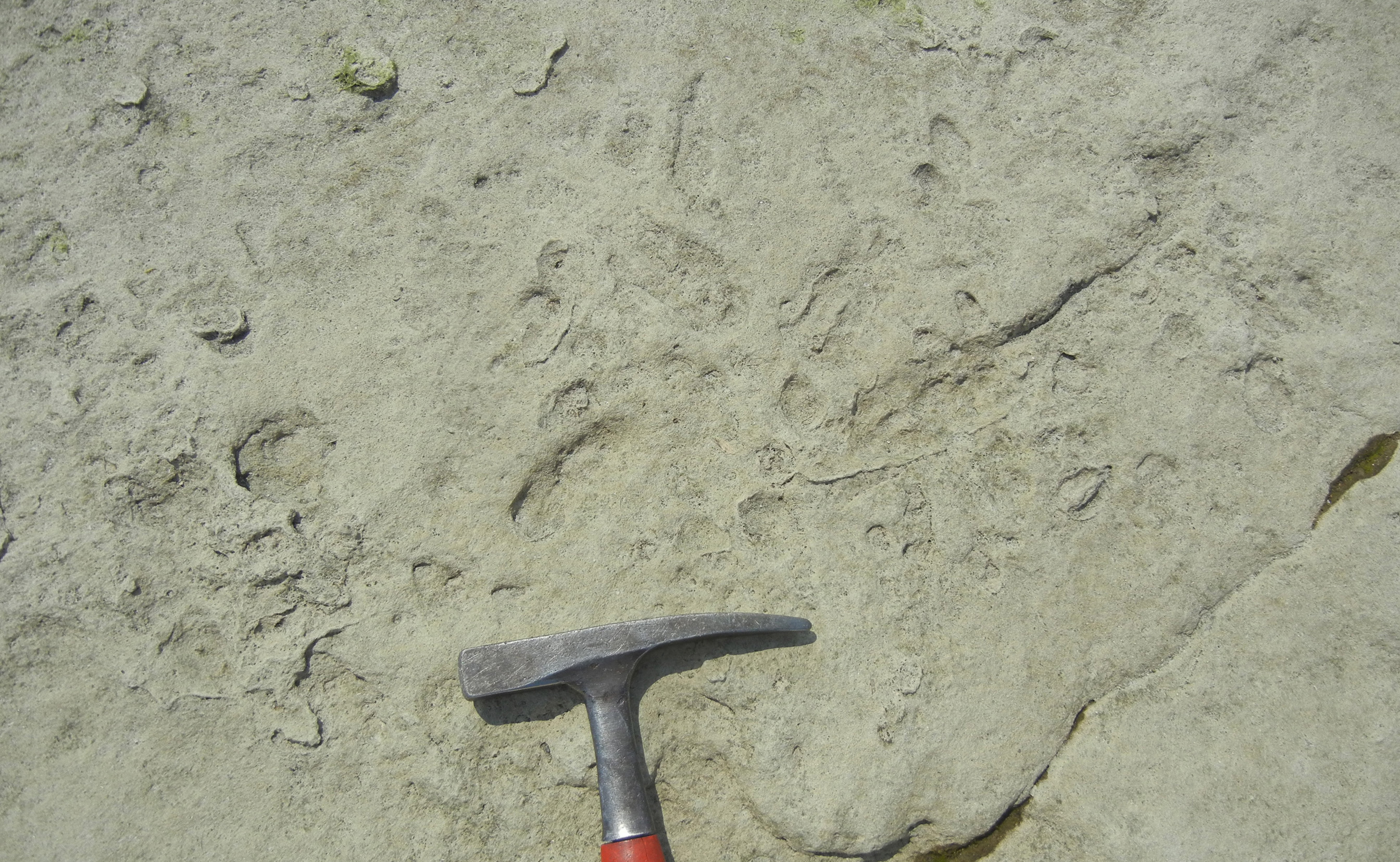 約2000万年~約1700万年前,この辺りは湖だった。ここにゾウ,サイ,シカ,ツルなどの動物が,食べ物を求めてやってきた。このときにできた足あとが化石になったものである。たくさんのへこんでいるところが,すべて動物の足あと化石である。