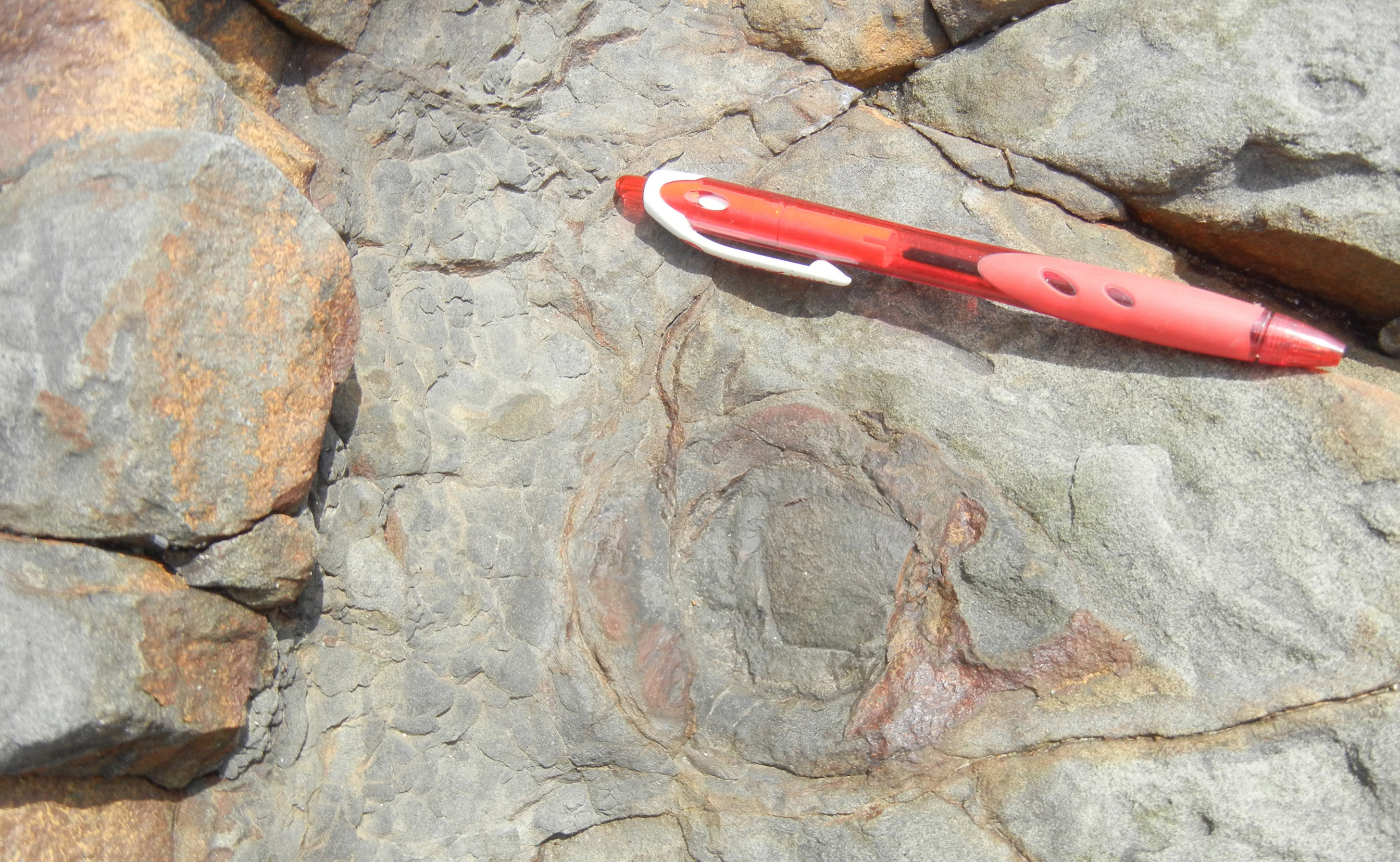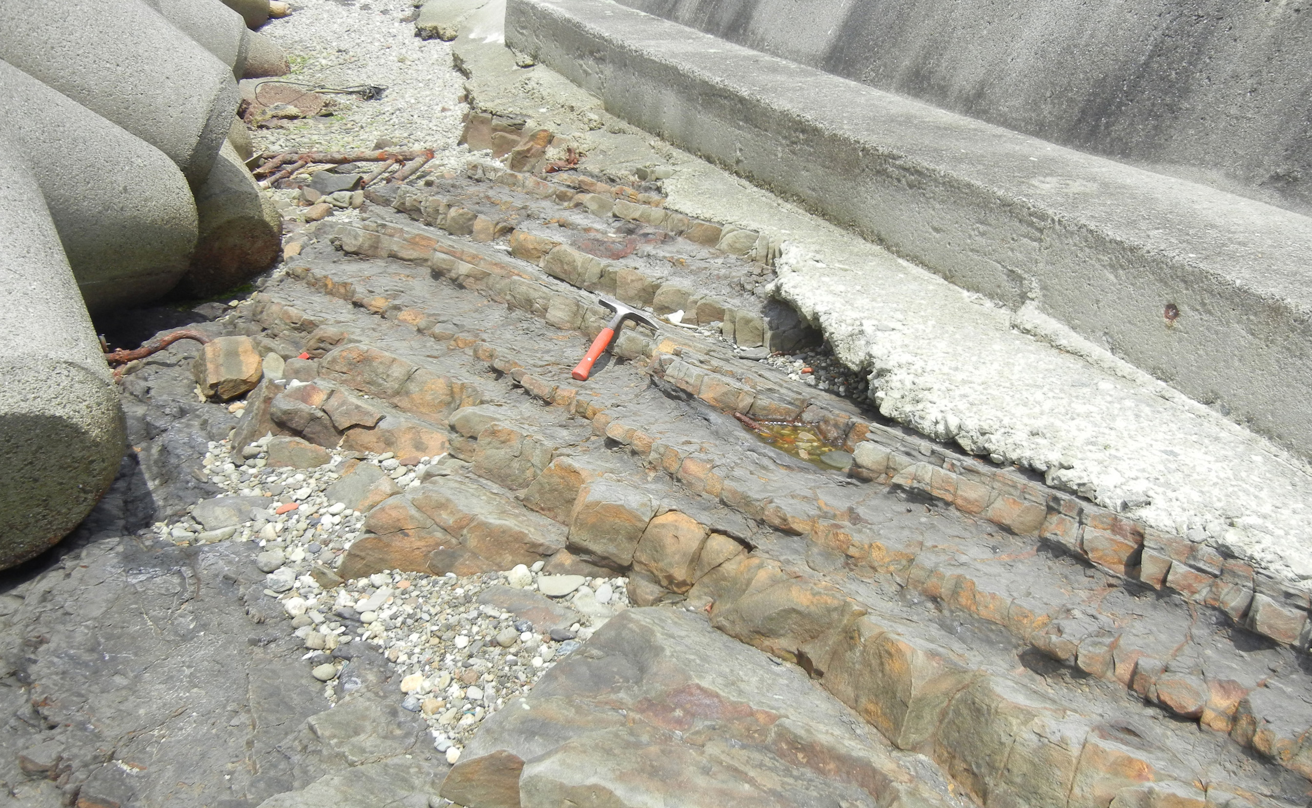 砂岩とでい岩のようすがよくわかる。丸い部分はアンモナイトの化石と思われる。