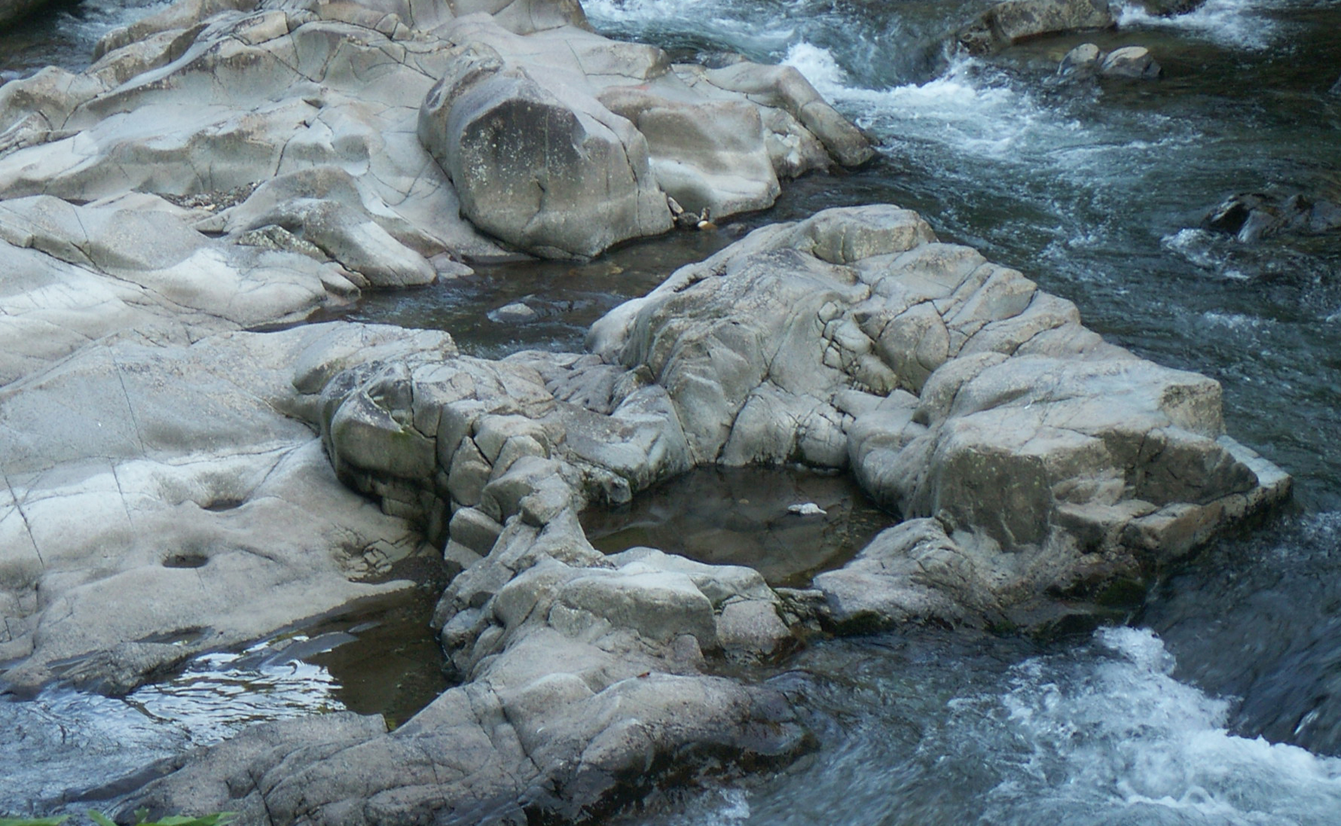 川はばはせまく,流れが速い。角ばった大きな岩がごろごろしている。この大きな岩も台風のときのような大量の雨水に流されたと考えられる。川の周辺には,ポットホール(おう