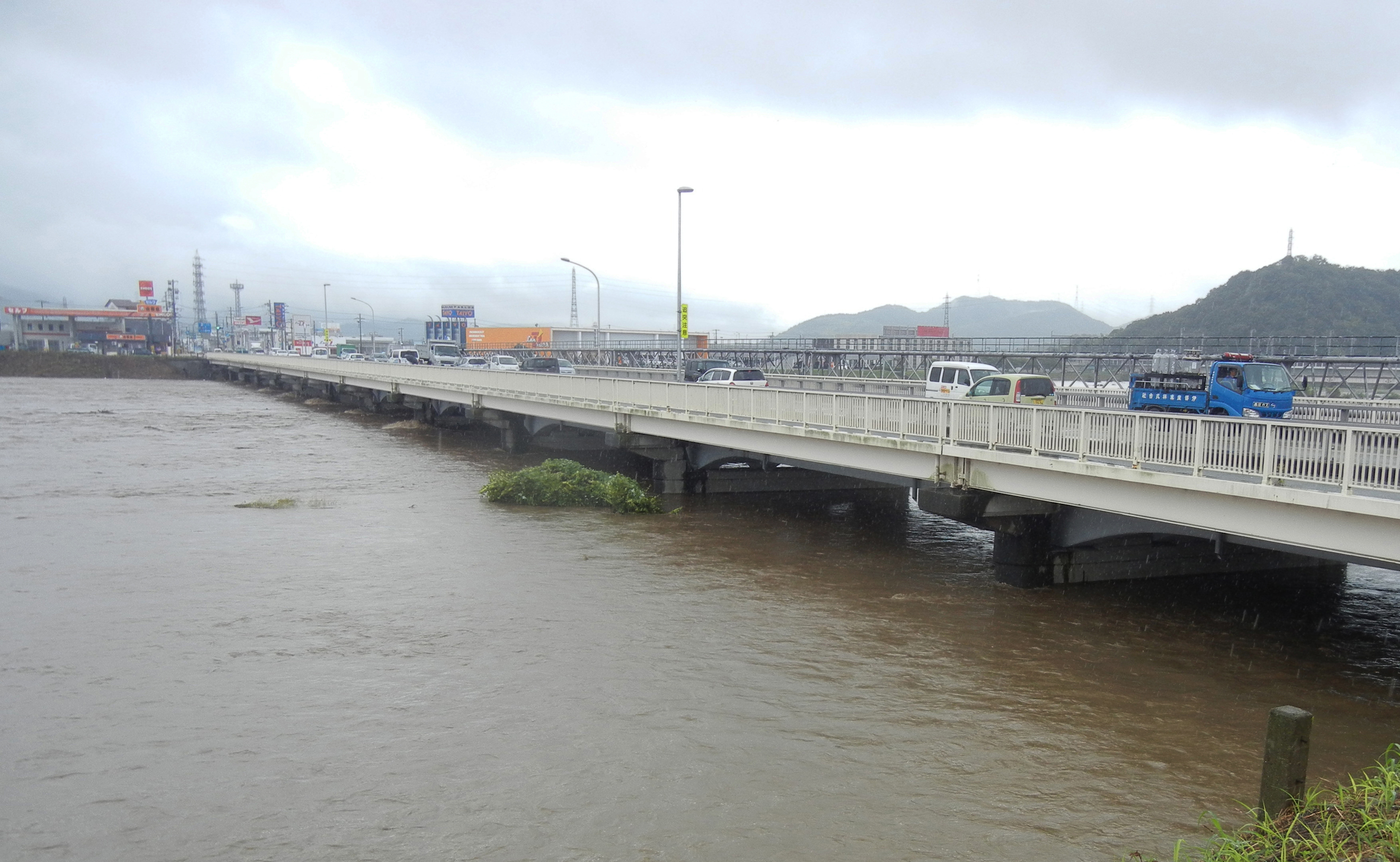 じり,にごっている。土手まで川はばが広がっており,水面の位置も高く,水の量が多いようすがわかる。