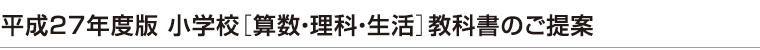 人間教育,人類文化の向上に寄与する」 これは昭和41年に制定しました,当社の企業目的を示した憲章の一文です。ここに示すとおり,我が社は創業以来,教育に関する出版活動一筋に邁進し,教科書・自習書・児童書の発刊に努めてまいりました。その中心としてきた教科書では,現在に至るまで「理数の啓林館」と親しまれてまいりましたが,理数教育に対する期待がますます大きくなってきました今こそ,専門出版社として,児童生徒の学びはもちろん,教育現場を強力にサポートさせていただき,日本の理数教育向上に貢献していきたいと思っております。ここに,平成27年度版 小学校[算数・理科・生活]教科書をご提案させていただきます。「児童の主体的な学びを応援する教科書」をコンセプトに,各教科とも,現場のニーズを踏まえた数々の工夫・改善を加えて,大幅にリニューアルいたしました。ご採択に向け,ご検討いただきますよう,よろしくお願いいたします。