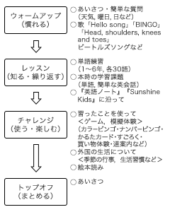 - 英語らしい音の流れを聞かせる。(リズムにことばを乗せたチャンツで,音の流れを意識する。)