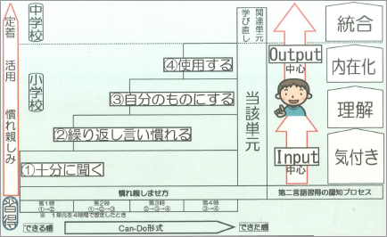 第二言語習得論の「気付き」→「理解」→「内在化」→「統合」の過程に沿って,児童・生徒が英語を習得していくことを踏まえ,小学校段階では,特に英語への「気付き」や「理解」を促す英語への慣れ親しませ方を検討した。