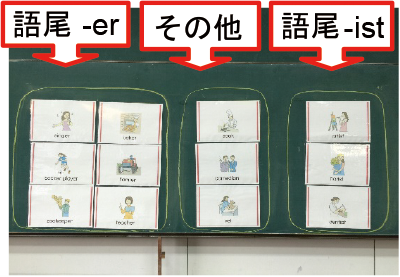 まず,言語構造の気付きに関しては,Hi,friends!2 Lesson8「『夢宣言』をしよう」では,teacher,bakerなど"-er"で終わるものやflorist,artistなど"-ist"で終わるものが多いことに気付かせた。その際には,始めから文字を提示するのではなく,文字をテープで隠した絵を提示することで,音声に意識を集中させながら気付きを促し,次に,絵と文字を一緒に提示することで,理解につなげるようにした。