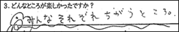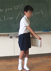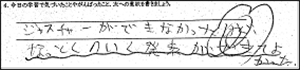 全員のパフォーマンス後,ルーブリックに基づき,自己評価し,自分を含めベストパフォーマーを選んだ結果,ひこにゃんの児童が選ばれた。それは,彼の『ALTに教えてもらって言った英語はわからないが,その時の動きから言っていることは理解できたこと』,『canとcan'tが聞き分けにくいが,ジェスチャーにより補っていたこと』がその理由だったため,通塾児童が有利になるわけでもなく,恥ずかしがらずに大きなジェスチャーで伝えることが大切だと学ぶことができた。
