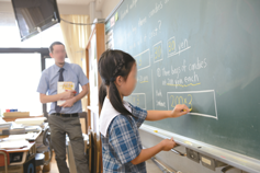 また,英語の算数では,多くの算数特有の用語が登場する。‘Division’や‘Multiplication’といった算数用語や‘distance’と‘travel distance’などの意味の違いに関しては,事前に宿題のスペリングワークシートで理解していることで,英語の語彙が理解できない為に学習内容が理解できないといった問題を避けることができている。それでも,英語だけでは理解し難い事柄については,半具体物や具体物を使った操作を多く取り入れ,場面設定をより具体的に設けたり,視覚教材を用いたりする事で,児童が意味を推測したり,理解したりできるように工夫している。