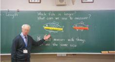 - Model measuring the length of the fish on the blackboard.