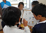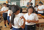 毎時間のToday's GoalやSmall Talkでは担任やALTの先生の筆箱やバッグの中を紹介したり,児童に持っているかを尋ねたりすることで意識を高めていった。中でも,一人のALTの先生が“I have a lunch box.”と言ったとき,バッグの中にお弁当が入っていることに児童たちは驚いた。が,すかさず“Do you have a おはし?”と聞き返す児童。“Yes,I do. I have chopsticks.”“Wow!”そこには生きた相手理解がはたらき,その後は給食時間を共にするときを楽しみに待ち,会話がもっとはずむようになっていった。