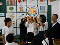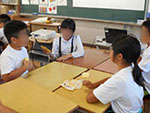 外国語教育の大きなねらいは,コミュニケーション能力の育成である。そこで,授業の中には,様々な人と関わる場面を設けるとともに,ペアやグループ等多様な学習形態を意図的に取り入れ,児童が「人と関わりつながり合う喜び」や「コミュニケーションの楽しさ」など,体験を通して実感できるよう努めている。また,関わり合いの中で,相互理解が深まり,学び合いが生まれることも期待している。