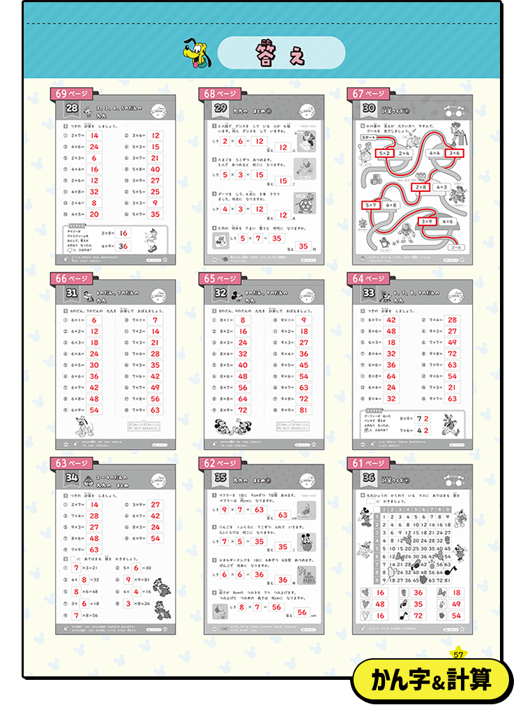 ミッキーマウスとその仲間たち、『ディズニープリンセス』、『トイ・ストーリー』など、人気のキャラクターが各ページに登場し、学習を楽しく進められます。