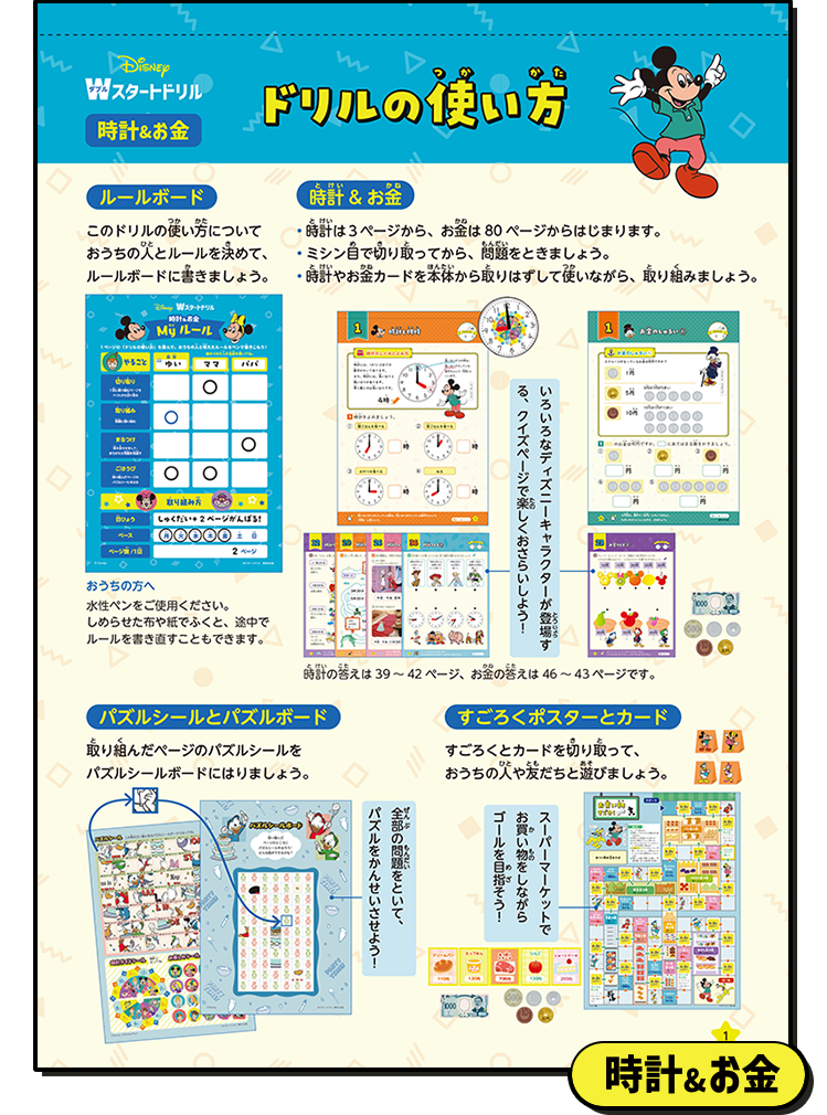 各ドリルには、お子さまの学習を強力にサポートし、達成感を高めるための「5大グッズ」がついています。特に、1ページ終えるごとにシールを貼り、1冊完成するとディズニーキャラクターのイラストが完成する「パズルシール」は、お子さまの「できた!」を視覚化し、学習継続の大きなモチベーションとなります。