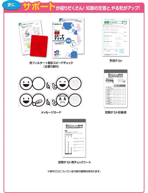 お使いの教科書に単元の並びや学習内容をぴったりそろえて作られた教科書準拠版問題集です。テストによくでる問題ばかりを厳選したので、1週間前からのテスト対策はこの一冊で大丈夫なんです。