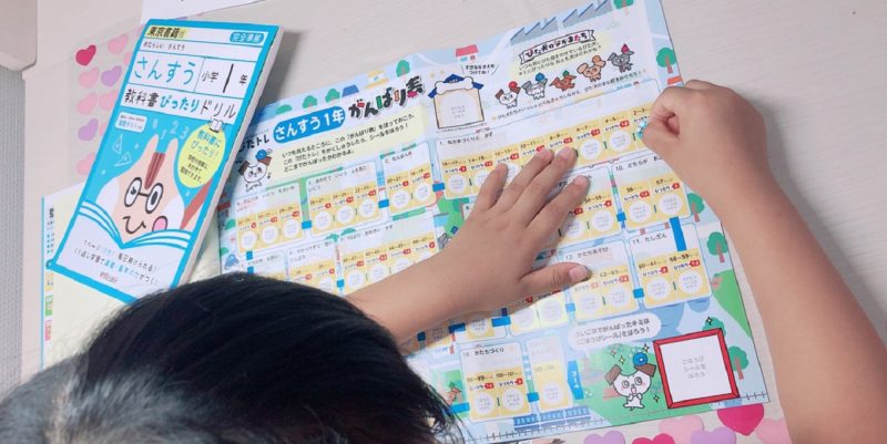 問題が終わって答え合わせも終わると、おたのしみ表にシールを貼ることにしています。このおたのしみ表にシールを貼ることが楽しいようで、勉強のモチベーションにもつながっているようでした。