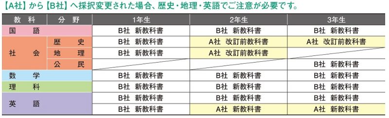 英語は使用する教科書の出版社が変更となった場合、原則1~3年生すべて変更後の出版社の教科書となりますが、一部の地域では1年生だけ変更後の出版社の新しい教科書を、2~3年生は変更前の出版社の新しい教科書を使用する場合があります。