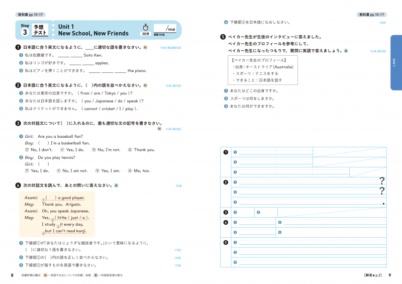 問題についている「知」「考」のマークは、成績がつけられるときの観点に直結しています。成績アップの参考にご利用ください。80点以上を目指したい人は「考」マークの問題がクリアできるまでチャレンジしましょう。