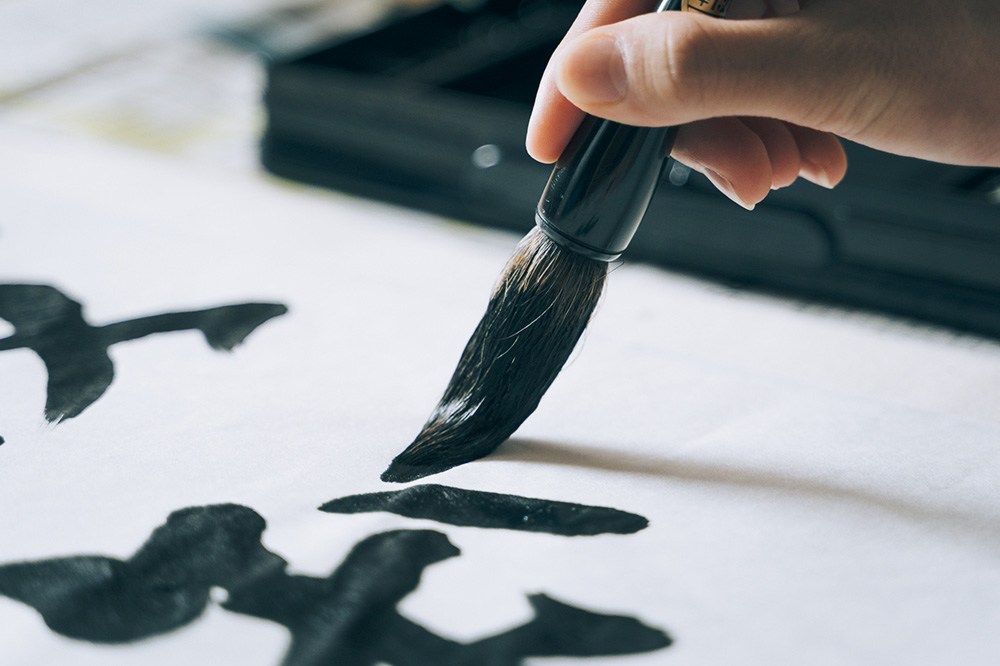 筆は真ん中より下の部分をもち、垂直に立てたまま書くのが正しい方法です。鉛筆のように寝かせて書くのはNG。太い部分を書きたいときでも筆先を力いっぱい紙に押し付けるのはよくありません。筆が傷まないように丁寧に扱いましょう。