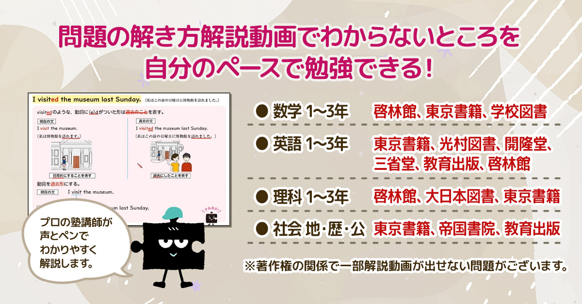 一部教材では、動画で解き方解説も無料で視聴できるため、学校の授業のような感覚で復習することができます。
