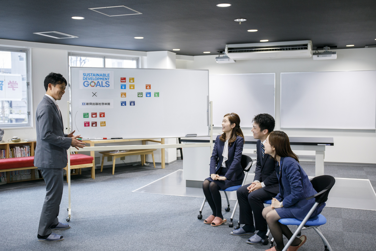 中嶋:実は、営業部の名前が「教育推進部」に変わったあたりから、コミュニティや他の企業さんと連携して子どもたちの教育にもっと広く深く携わっていこうということになりました。これまでは学校や教育委員会などとやり取りするのが中心でしたが、世の中に目を向けてみると啓林館以外にも子どもをサポートする事業をしている会社さんというのはたくさんあるんですよね。そういうところと連携したり、教材の中で取り上げたりという取り組みが私の部署では盛んになってきています。ただ、まだ一部の地域のみですので、これからもっとそうした取り組みや姿勢が広がっていけば「啓林館っていろいろ挑戦している企業なんだ」というふうに見ていただけて、その繋がりからまたSDGsを実現する機会も増えていったらいいなと思っています。