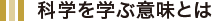 今、しばしば理科離れが話題となっている。理科の教科のみならず、大学生の学力全般の低下は多くの大学人が日々感じていることである。これは単に小学校からの教育の問題ではなく、日本の社会の抱えている根本的な問題点であるように思う。小学校ではそれほど深刻ではないが、中学校・高校と進むにつれ、役に立つという視点だけで教育がなされたり、一人ひとりの個性を無視して機械的に数値で評価する風潮が強くなりがちである。教育の現場でも、また社会でも、子どもの「こんなことは将来何の役に立つの?」という素朴な疑問に答えられていないように思う。